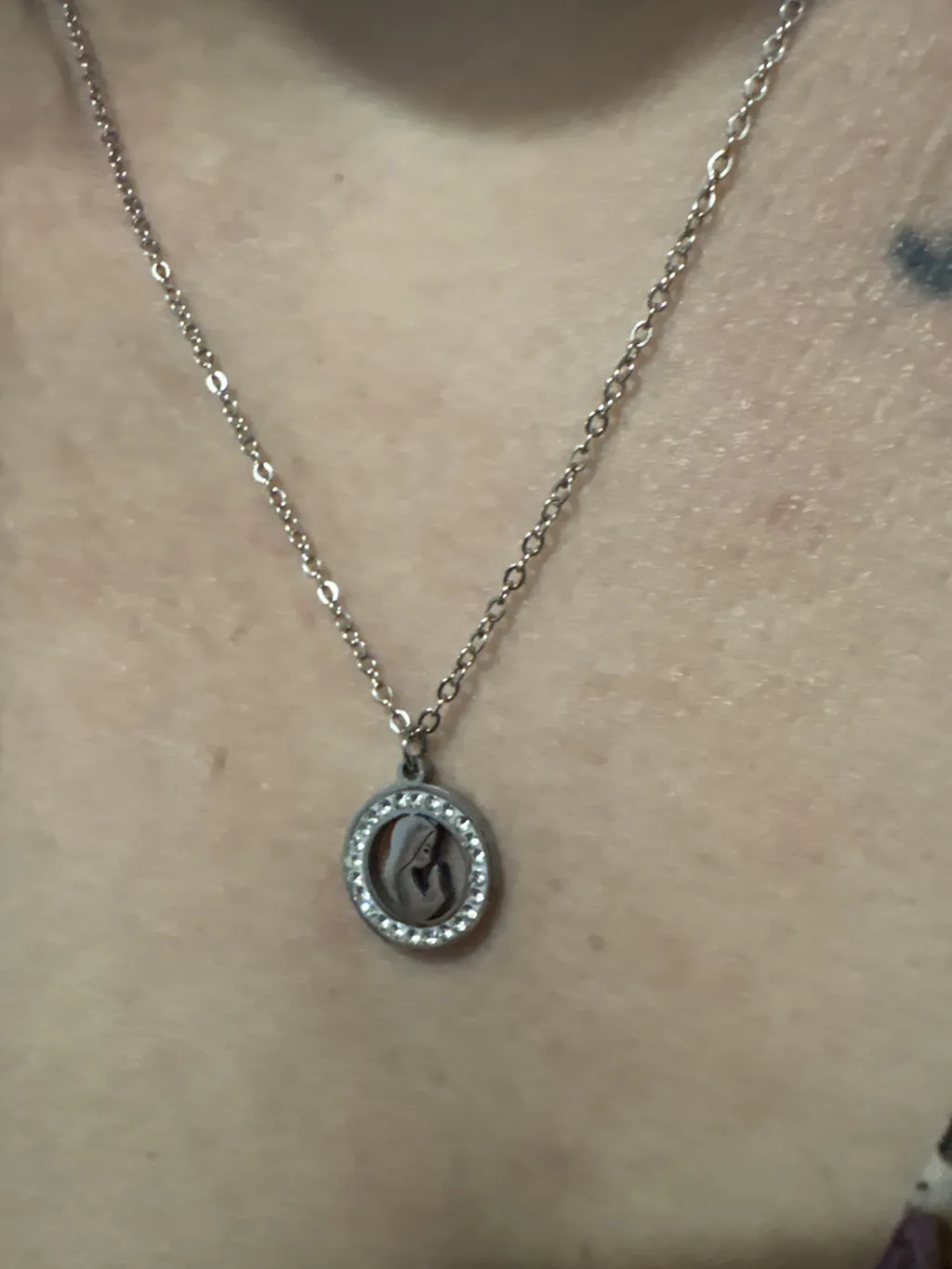 Ce collier délicat représente Marie en prière, symbole de foi, d’abandon à Dieu et de confiance dans les épreuves.